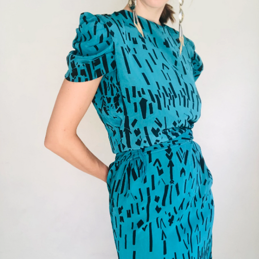 80'S VINTAGE TURQUOISE PRINTED COWL DRESS // SIZE SMALL