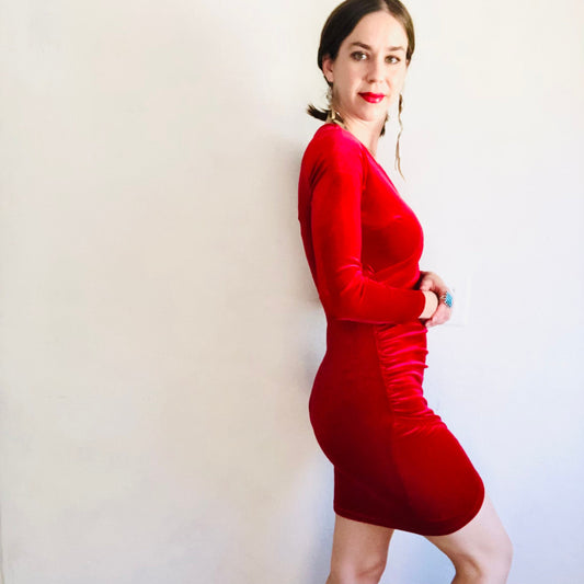 90'S VINTAGE VELOUR RUCHED DRESS // SIZE SMALL