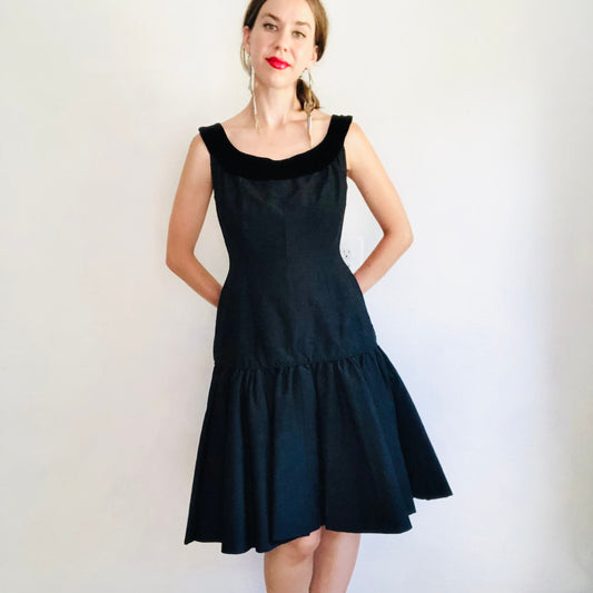 60'S VINTAGE BLACK VELVET & SHANTUNG MINI DRESS // SIZE SMALL