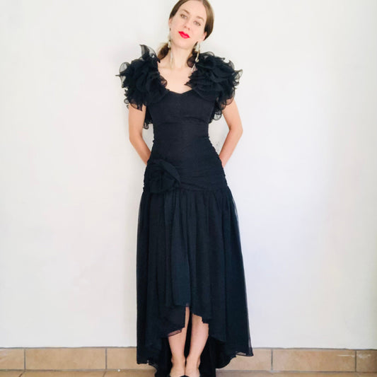 80'S VINTAGE BLACK CHIFFON RUFFLE SLEEVE DRESS // SIZE XSMALL