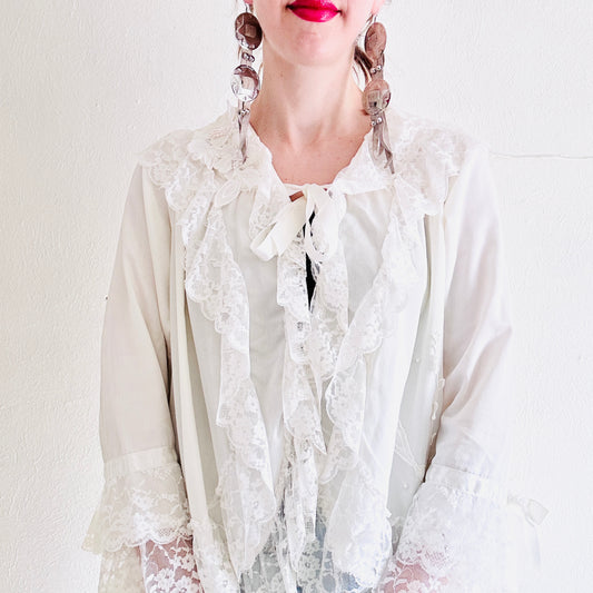 80'S VINTAGE WHITE LACE LINGERIE ROBE // SIZE MEDIUM LARGE