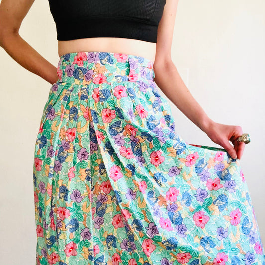 80'S VINTAGE GREEN FLORAL MIDI SKIRT // SIZE SMALL