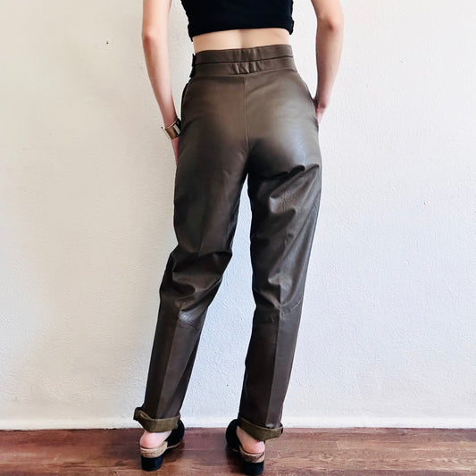 90'S VINTAGE BROWN LEATHER PLEATED PANTS // WAIST SIZE 27