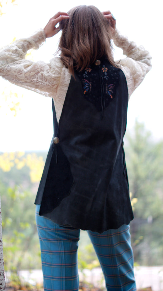 60'S VINTAGE BLACK HAND PAINTED LEATHER VEST // SIZE SMALL