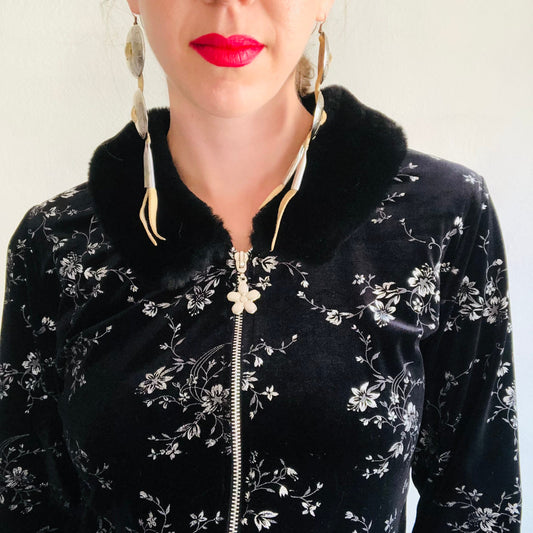 90'S VINTAGE BLACK CHINESE PRINT VELOUR JACKET WITH FAUX FUR COLLAR // SIZE SMALL