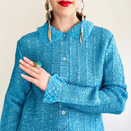 90'S VINTAGE TURQUOISE CRINKLY JACKET BLOUSE // SIZE LARGE
