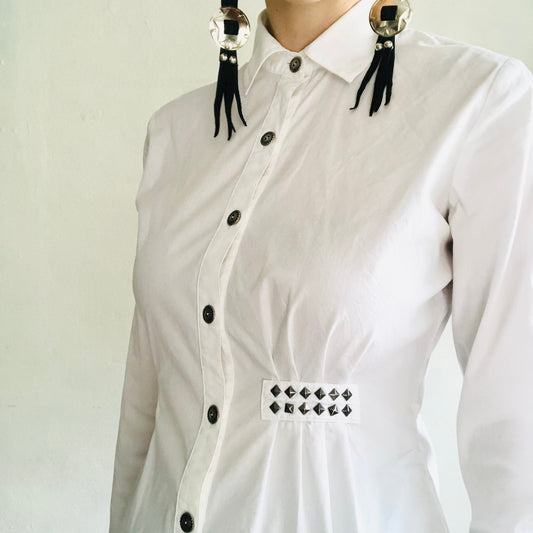 Y2K VINTAGE WHITE STUDDED ASYMMETRICAL BLOUSE // SIZE SMALL