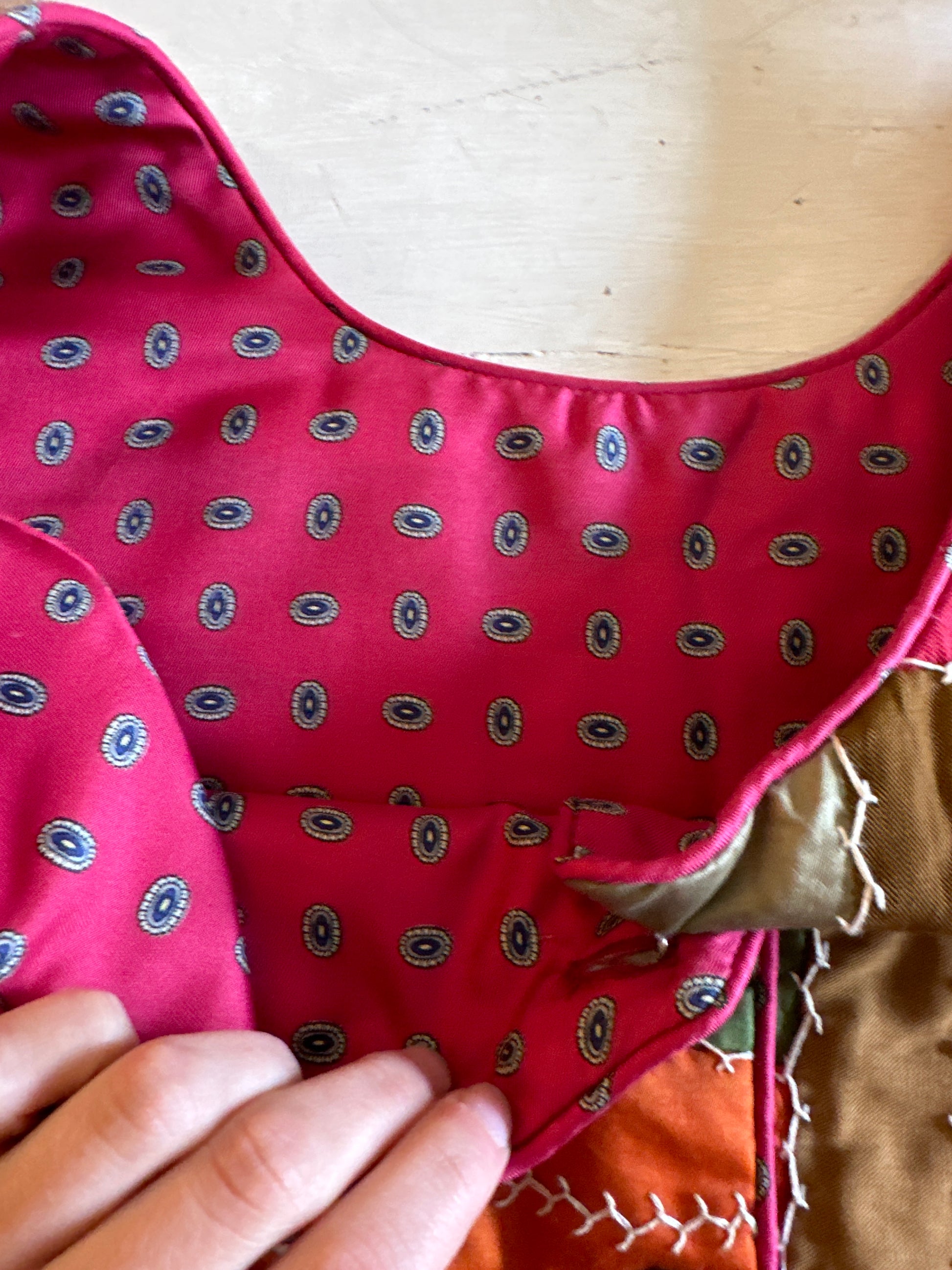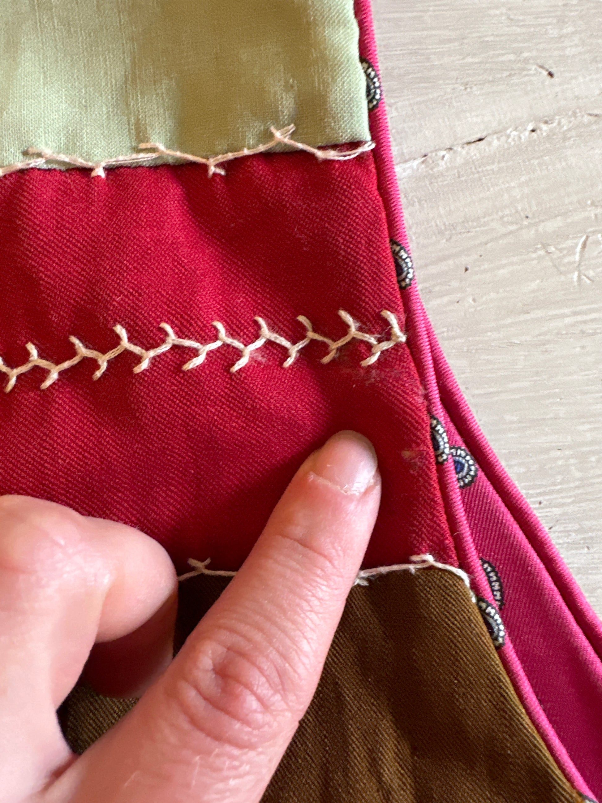 - Red, brown, orange, green, and gold silk patchwork